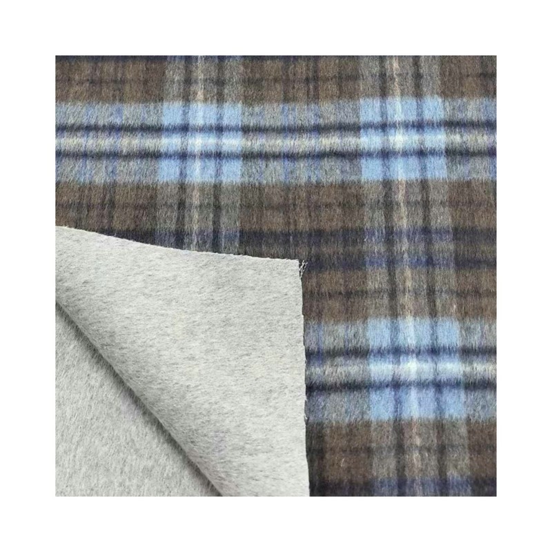 Kain ini, yang diberi label artikel ZZH25003, merupakan tekstil tenun kelas berat yang terdiri dari 50% wol dan 50% serat lainnya. Dengan massa per satuan luas 950 g/m, material tersebut menunjukkan kepadatan dan berat yang besar. Permukaannya menampilkan pola kotak-kotak yang memadukan warna biru dan coklat dalam formasi kisi-kisi terstruktur. Kategori berat ini berkontribusi terhadap hambatan angin dan kapasitas isolasi kain. Komposisi campuran wol mempengaruhi sifat pengaturan termal tekstil. Spesifikasi teknis ini membuat kain tenun ini dapat digunakan untuk mantel musim dingin yang memerlukan perlindungan besar dari kondisi cuaca dingin.