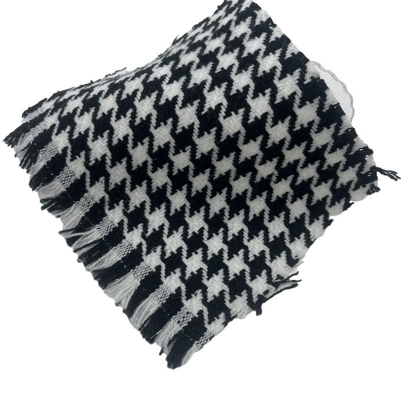 Kain ini merupakan tekstil tweed jacquard yang tersusun dari 97% benang akrilik dan 3% benang perak, dengan massa per satuan luas 250 gsm. Ini menampilkan pola houndstooth hitam dan putih yang terintegrasi dengan elemen logam selama proses tenun jacquard. Basis akrilik memberikan konsistensi struktural dan retensi warna, sedangkan benang perak memberikan sifat reflektif cahaya pada polanya. Konstruksi ini menghasilkan kain dengan motif geometris dan kontras permukaan yang jelas. Berat dan komposisi yang ditentukan berkontribusi terhadap daya tahan material dan kemudahan perawatan. Karakteristik teknis ini membuat wol jacquard ini dapat digunakan untuk proyek pelapis yang memerlukan visibilitas pola dan kinerja fungsional.