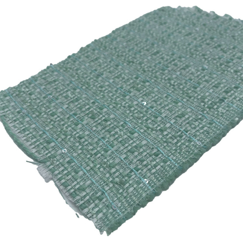 Kain ini, yang ditetapkan sebagai pasal 22102, adalah tekstil wol jacquard yang terdiri dari 90% poliester dan 10% wol. Dengan massa per satuan luas 320 gsm menghadirkan konstruksi ringan yang cocok untuk gaun. Basis hijau muda menampilkan pola jacquard timbul, di mana payet diintegrasikan selama proses menenun untuk menciptakan area reflektif lokal. Kandungan poliester yang tinggi memastikan stabilitas dimensi dan retensi bentuk, sedangkan komponen wol berkontribusi pada sifat sentuhan kain. Kombinasi ini menghasilkan material dengan variasi tekstur permukaan dan konsistensi struktural. Karakteristik teknis ini membuat wol jacquard ini dapat digunakan untuk gaun yang memerlukan permukaan dekoratif dan struktur garmen.