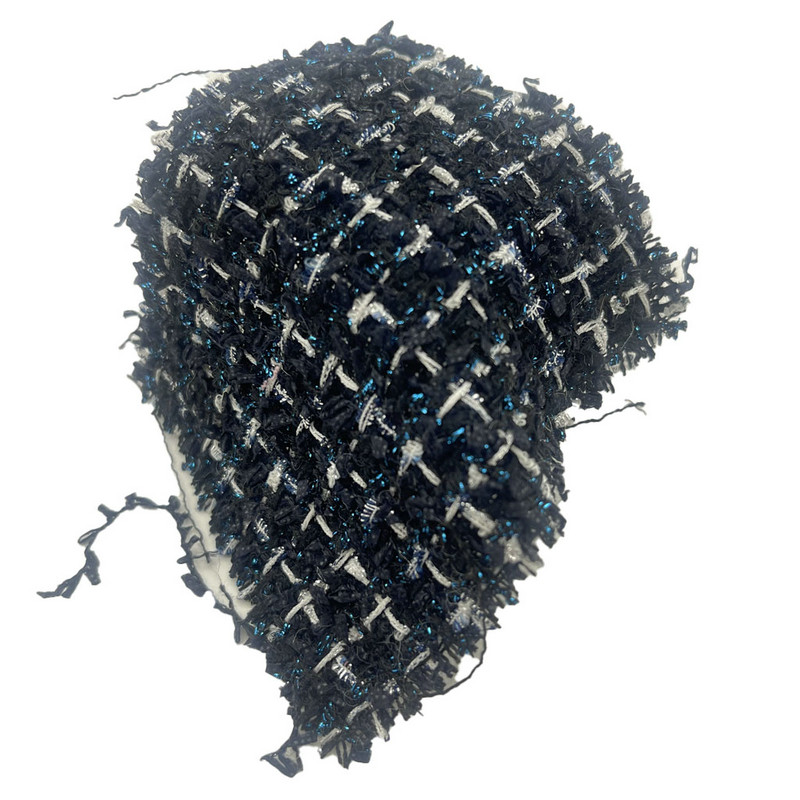 Kain ini, yang ditetapkan sebagai pasal 23511, adalah tekstil wol kotak-kotak yang terdiri dari 86% poliester dan 14% nilon. Dengan massa per satuan luas 340 gsm menghadirkan konstruksi yang ringan. Basis biru tua menggabungkan benang biru metalik dalam pola kotak-kotak, menciptakan efek visual yang kontras melalui pantulan cahaya yang bervariasi. Campuran poliester-nilon memberikan stabilitas dimensi dan konsistensi struktural. Dimasukkannya elemen logam menambah sifat interaktif cahaya pada permukaan tenunan. Spesifikasi teknis ini membuat kain tweed ini dapat digunakan untuk pakaian wanita yang memerlukan artikulasi pola yang jelas dan variasi permukaan yang halus.